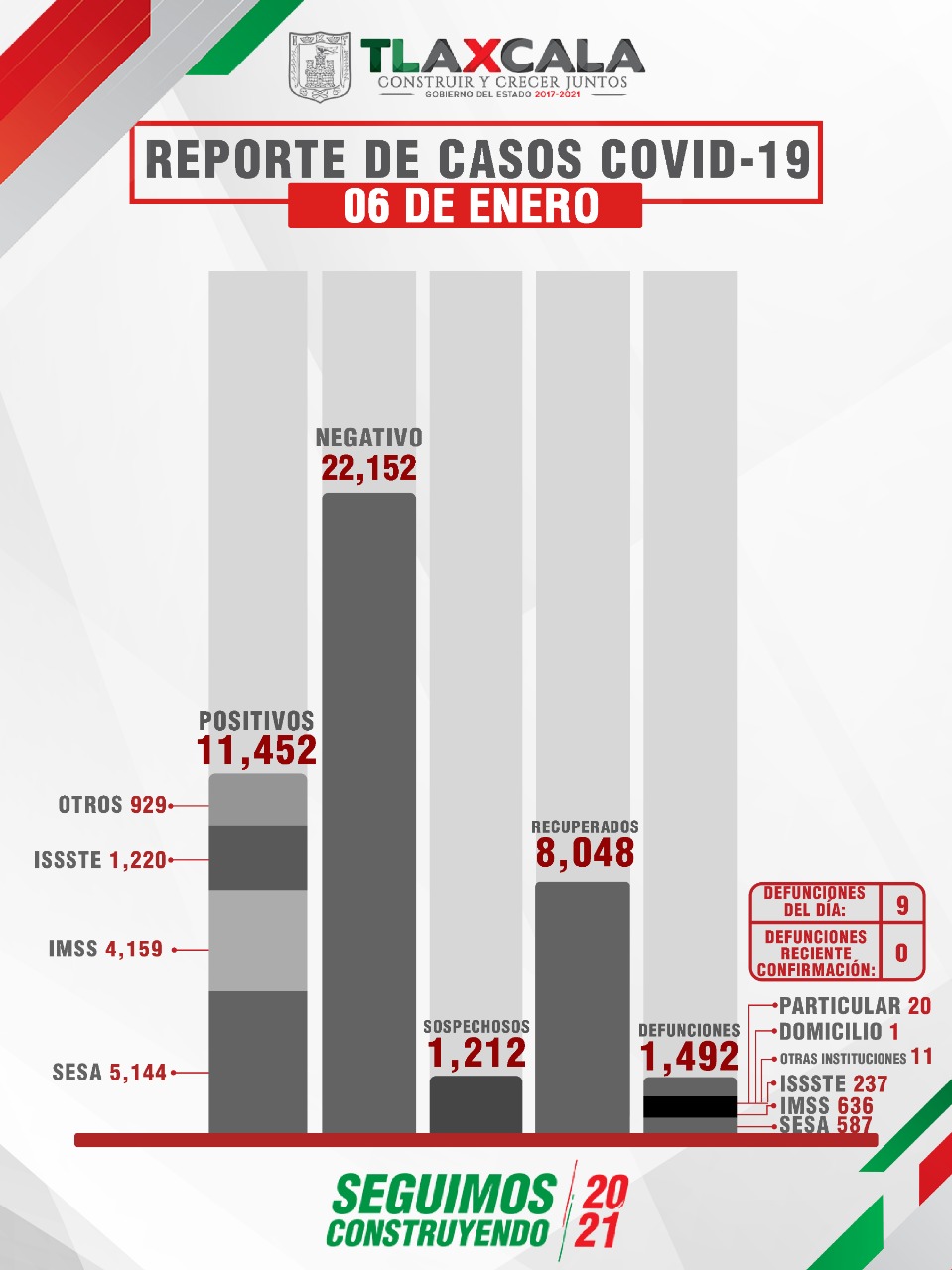 De acuerdo con el reporte del 06 de enero, la Secretaría de Salud del Estado (SESA) confirmó 37 personas recuperadas, 9 fallecimientos y 80 casos positivos de Covid-19 de tlaxcaltecas identificados en el estado y uno en otra entidad.