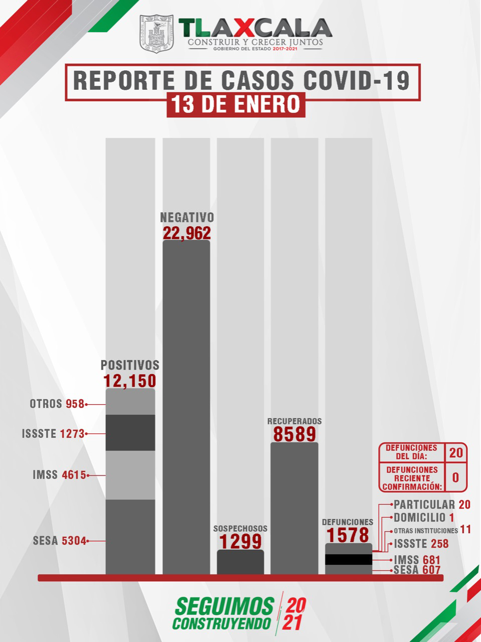 De acuerdo con el reporte del 13 de enero, la Secretaría de Salud del Estado (SESA) confirmó 58 personas recuperadas, 20 fallecimientos y 97 casos positivos de Covid-19 de tlaxcaltecas identificados en el estado y seis en otras entidades.