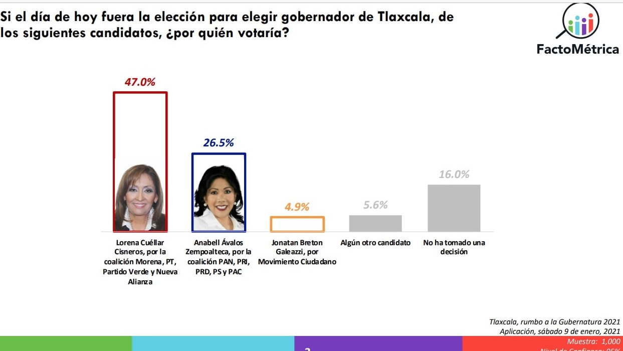 Este miércoles 13 de enero la casa encuestadora “FactoMétrica” publicó un estudio demoscópico donde se da a conocer que, si hoy fueran las elecciones en el estado de Tlaxcala, Lorena Cuellar Cisneros sería la triunfadora de la gubernatura.