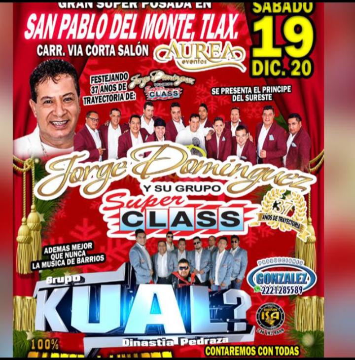 Se trata de la presentación del Grupo Super Class de Jorge Domínguez, el evento masivo está programado para el próximo sábado 19 de diciembre en el salón Aurea, donde también se contempla la participación del grupo Kual.
